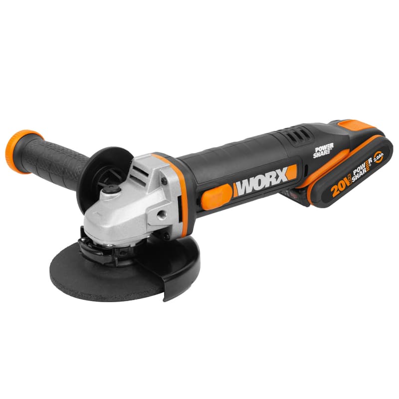 1 аккумулятора Li-Ion емкостью 2,0 А*ч (WA3551.1), 1 аккумулятора Li-Ion емкостью 4,0 А*ч (WA3553), Боковая рукоятка, Зарядное устройство WORX 20В (WA3880), Защитный кожух, Кейс., Ключ, УШМ WORX WX800, Шлифовальный диск по металлу